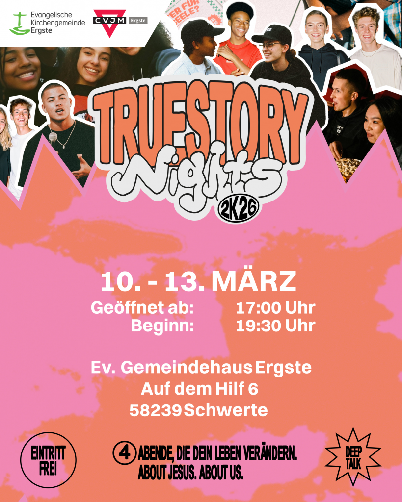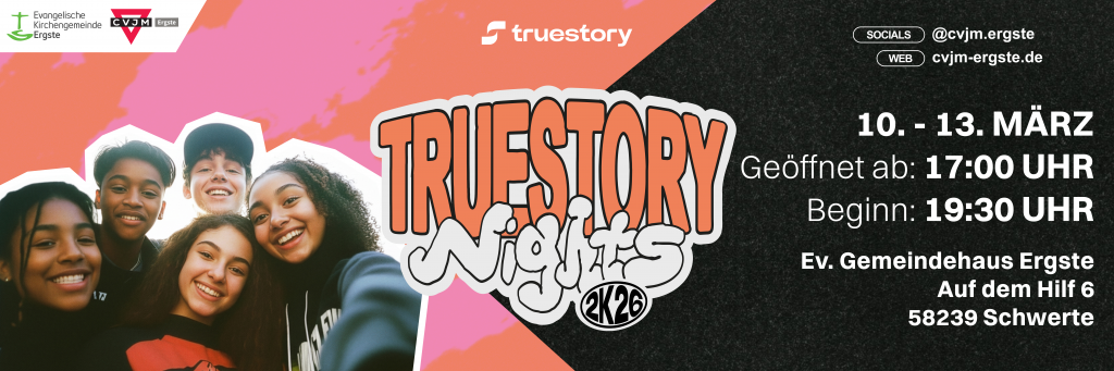 In diesem Frühjahr finden deutschlandweit vom 16. Februar bis zum 29. März die „TRUESTORY NIGHTS 2026“ statt: Gemeinden sind eingeladen, eine Jugendwoche zu veranstalten, „damit Teens Jesus kennenlernen“. Wir feiern TRUESTORY – die Geschichte Gottes mit den Menschen.